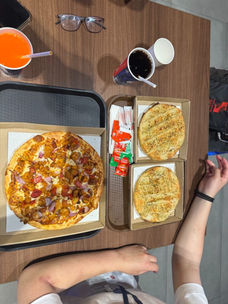 そんな反省や学びもありつつ、研修メンバーとバディたちと合流して、モールで夕食をとりました。今日は時間がそんなにないのもあり、外出初日ということもあり、フードコートで夕食を取る流れになりました。マックを食べる人たちもいたり、タピオカを飲んでる人もいたりしました。マックやケンタッキーが見えて、ちょっとの安心感と嬉しさを感じました。そして、フードコートにピザハットがあったので、フードコートには珍しいのもあり、食べることにしました。メニューを見ると、これもカレー味、これもカレー味、これもカレー味、これもカレー味、とカレー味ばかり、やはりここはインドなのかと。改めて実感しました。笑